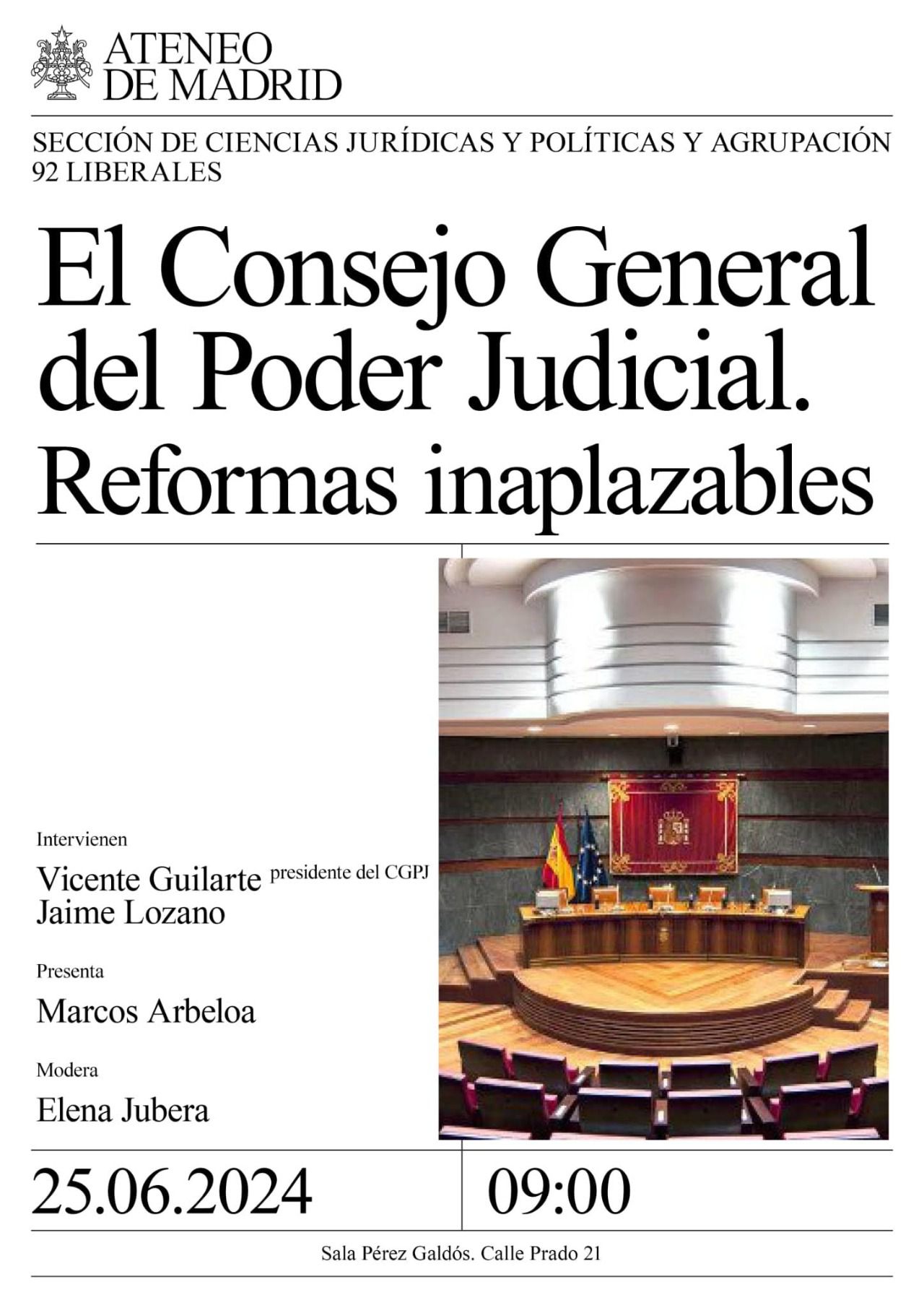 La Sección de Ciencias Jurídicas y Políticas del Ateneo de Madrid y la Agrupación 92 Liberales en el Ateneo, con la colaboración de la Plataforma Cívica por la Independencia Judicial, han convocado un debate sobre la renovación del Consejo General del Poder Judicial (CGPJ) bajo el título de "Reformas inaplazables" este martes, 25 de junio, a las 9.