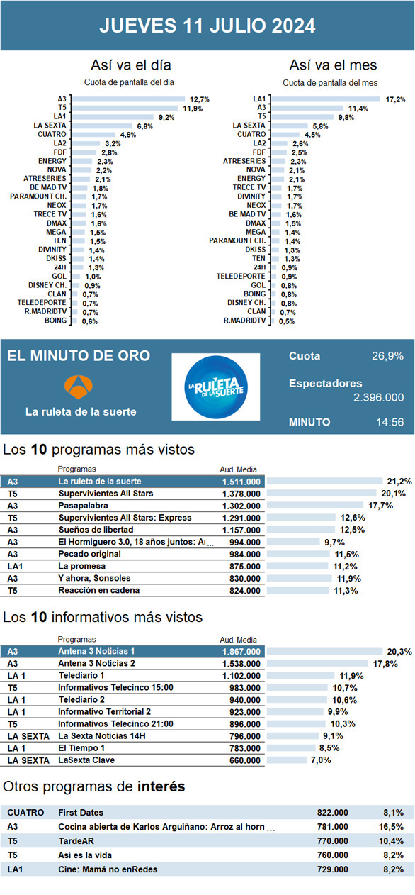 AUDIENCIAS: JUEVES 11 DE JULIO DE 2024