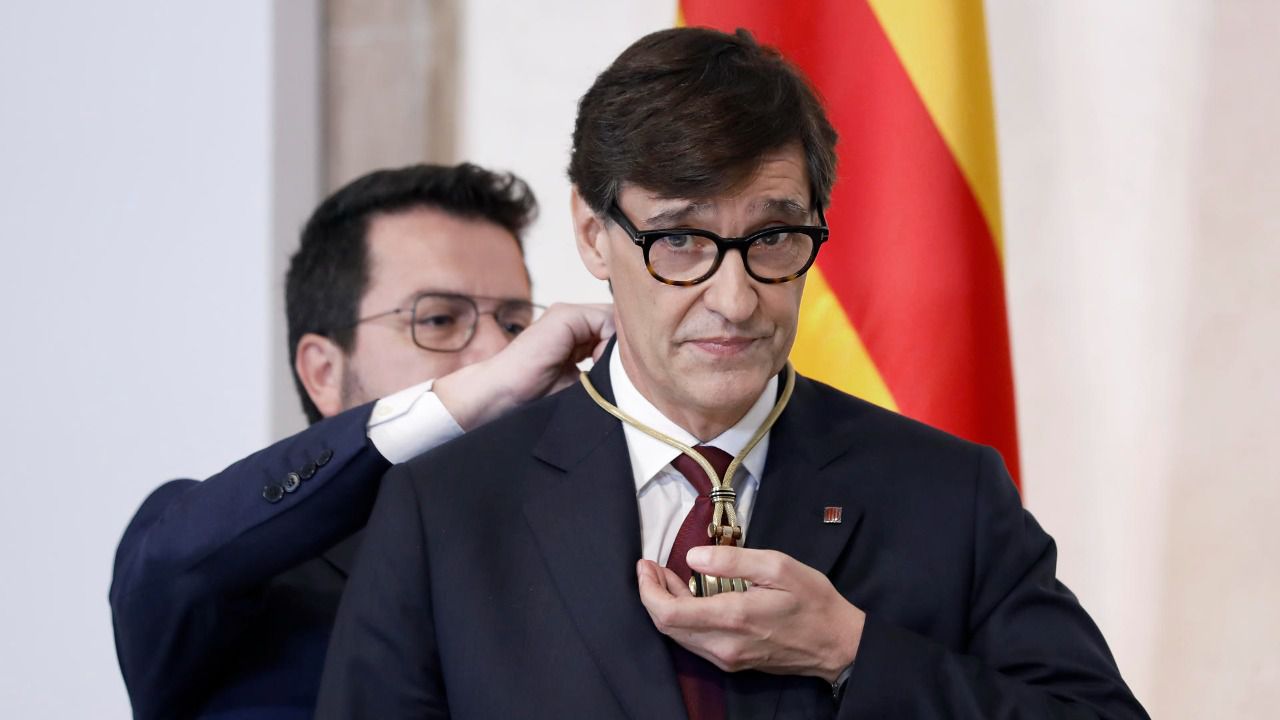 Pere Aragonés participó del acto en el Palau San Jordi como presidente saliente y le impuso al socialista la medalla presidencial. Esquerra es una de las grandes beneficiadas de estas semanas de negociaciones que han puesto en apuros la estabilidad funcional del Estado español. El avance del partido de Puigdemont les incomoda e Illa tuvo palabras de gratitud y reconocimiento para el dirigente indepdendentista. También para los expresidentes que, ha dicho, "han servido con los mejores propósticos y nobles intenciones para hacer de Cataluña un país mejor". Así ha empezado un discurso en el que ha descrito sus principales metas sin hacer mención del acuerdo de independencia fiscal que ha dejado al PSOE aún más tocado.