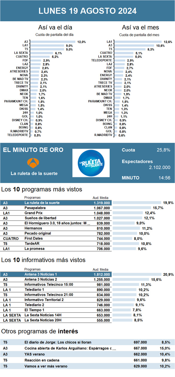 AUDIENCIAS: LUNES 19 DE AGOSTO DE 2024