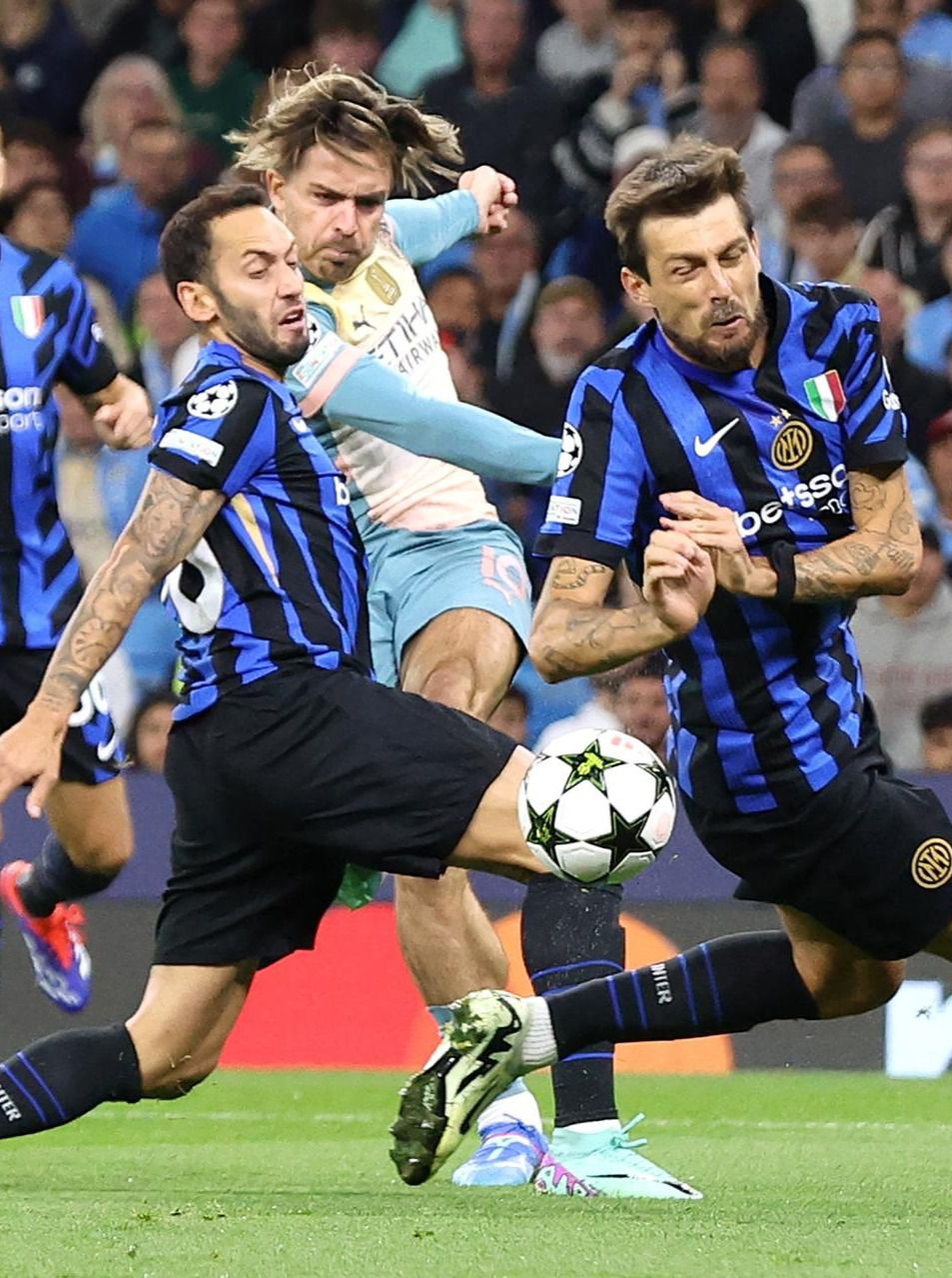 En torno a esa capacidad de distribuir desde la punta del iraní y a la clase autoritaria de Barella y Çalhanoglu creció un Inter al que no le quemaba la pelota. La templanza y precisión para aceptar el reto táctico del City les proporcionó una autopista en transición hasta la meta defendida por Ederson. Compitieron con ardor en el achique los italianos y con una fluidez clarividente en ataque, combinando al primer toque. Así, antes del minuto 25 ya había rematado cuatro veces la ofensiva transalpina, siempre al contragolpe. Lo probaron Marcus Thuram, el cerebro turco y Acerbi. Mientras, los Citizen no podían desequilibrar -Savio era el encargado de romper por su perfil pero le amarraron bien Carlos Augusto y el imperial Bastoni- y su adelantada presión no agobiaba a los creativos 'interistas'. El plan de Inzaghi salió a la perfección: bajaron los humos a los ingleses de inicio y a partir de ahí gestionaron las situaciones.