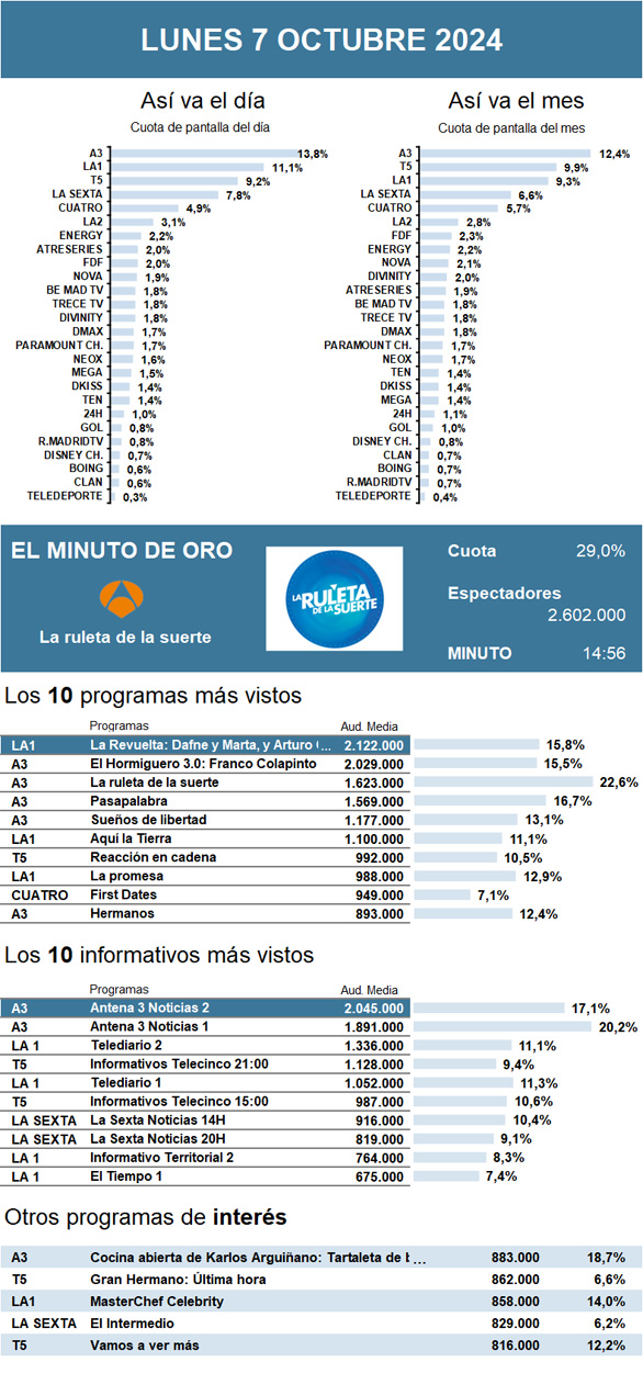 AUDIENCIAS: LUNES 7 DE OCTUBRE DE 2024