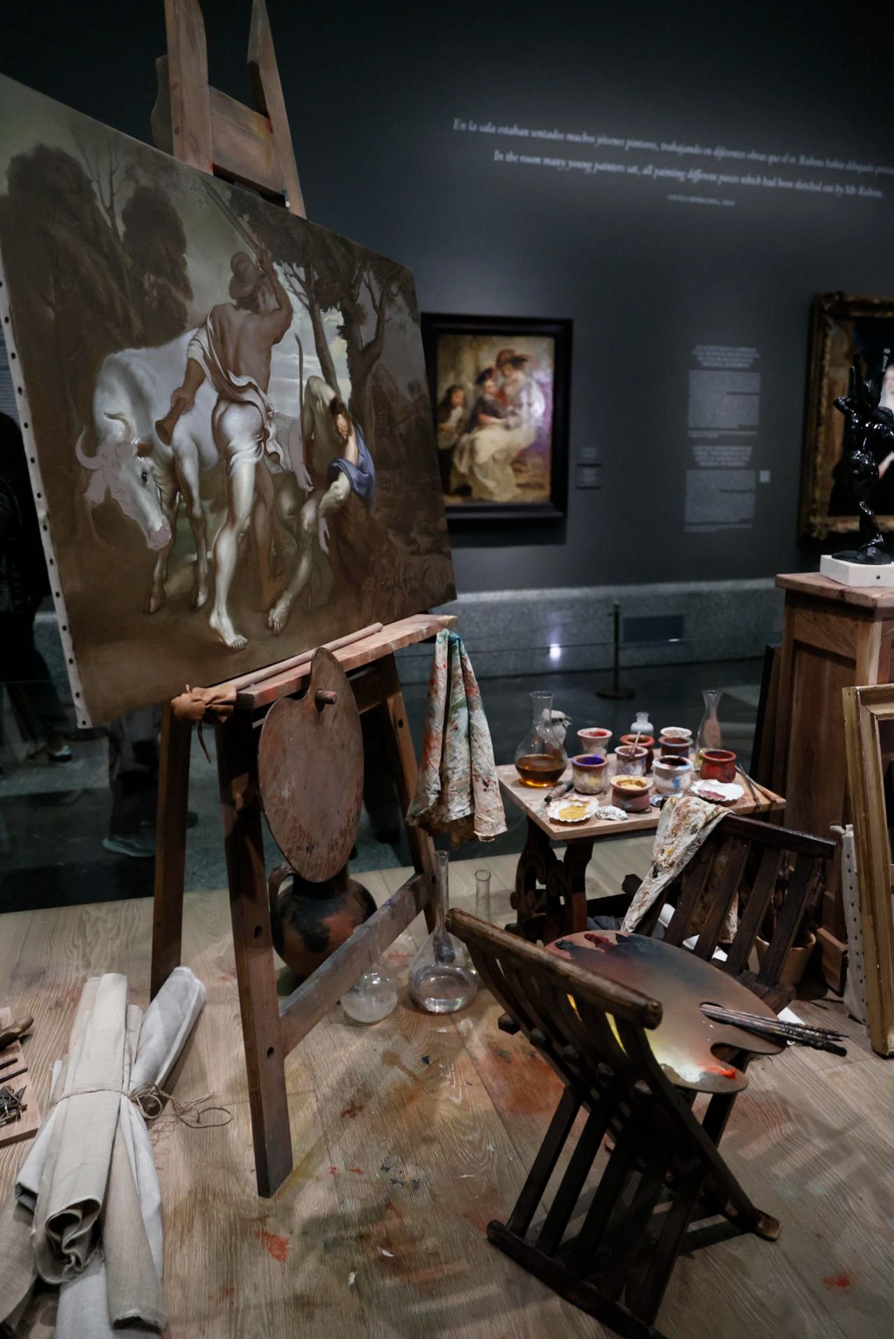 La exposición, que se podrá visitar hasta mediados de febrero del 2025, incluye una escenificación del taller u obrador de Pedro Pablo Rubens, uno de los pintores más exitosos y prolíficos de finales del siglo XVI y principios del XVII, que incluye bocetos, una obra inacabada, pinturas, caballetes o conchas de ostras y vieiras para guardar las pinturas, y hasta el sombreo y la espada del maestro flamenco, recreadas a partir de sus autorretratos.