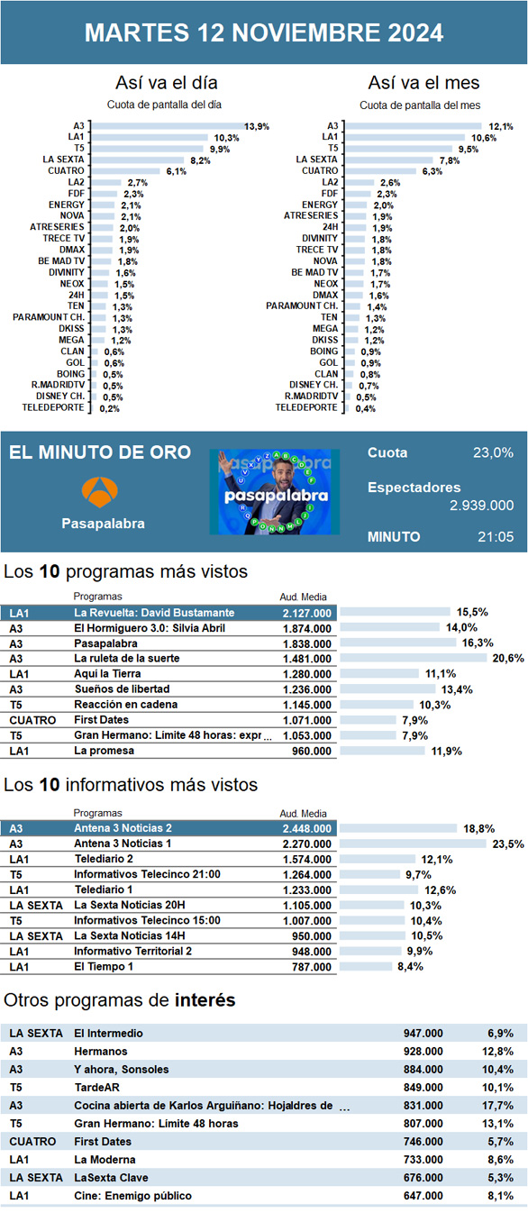 AUDIENCIAS: MARTES 12 DE NOVIEMBRE DE 2024
