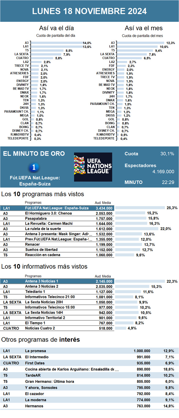 AUDIENCIAS: LUNES 18 DE NOVIEMBRE DE 2024