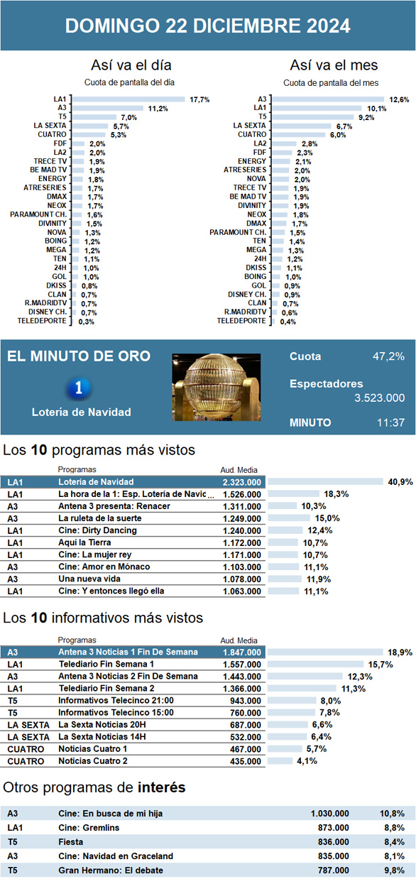 AUDIENCIAS: DOMINGO 22 DE DICIEMBRE DE 2024