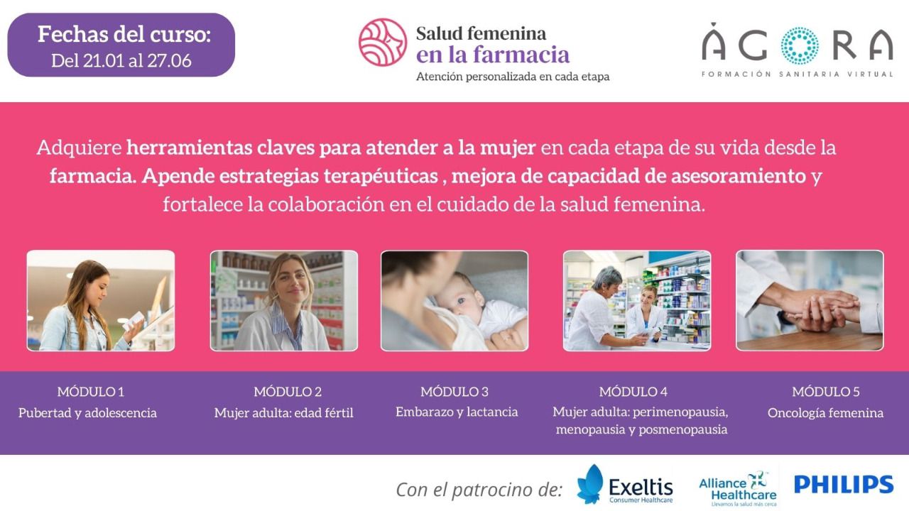 Con el objetivo de reforzar el valor de la farmacia en el abordaje de la salud femenina, ofrecer una formación continuada en este campo y aportar evidencia aplicable al día a día, Ágora Sanitaria, la plataforma de formación online de los Colegios Oficiales de Farmacéuticos de Madrid y Barcelona dirigida a profesionales sanitarios, lanza el curso Salud femenina en la farmacia: atención personalizada en cada etapa, que dará comienzo el 21 de enero y que cuenta con el patrocinio de Exeltis Consumer Healthcare, Alliance Healthcare y Philips.