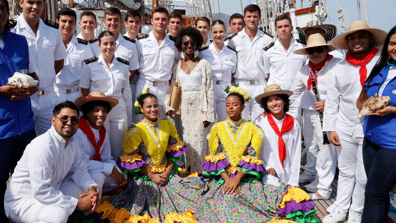 La tripulación fue recibida con los acordes de una agrupación musical tradicional del Caribe colombiano, la papayera, que interpretó la emblemática cumbia 'La pollera colorá', en medio de un ambiente festivo por la llegada del histórico navío.