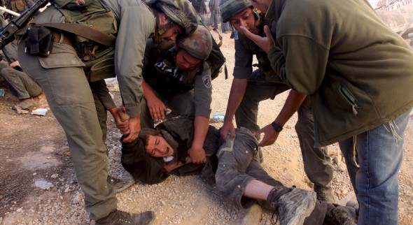 Unos soldados israelíes forcejean con un joven que se resiste a ser evacuado. Efe