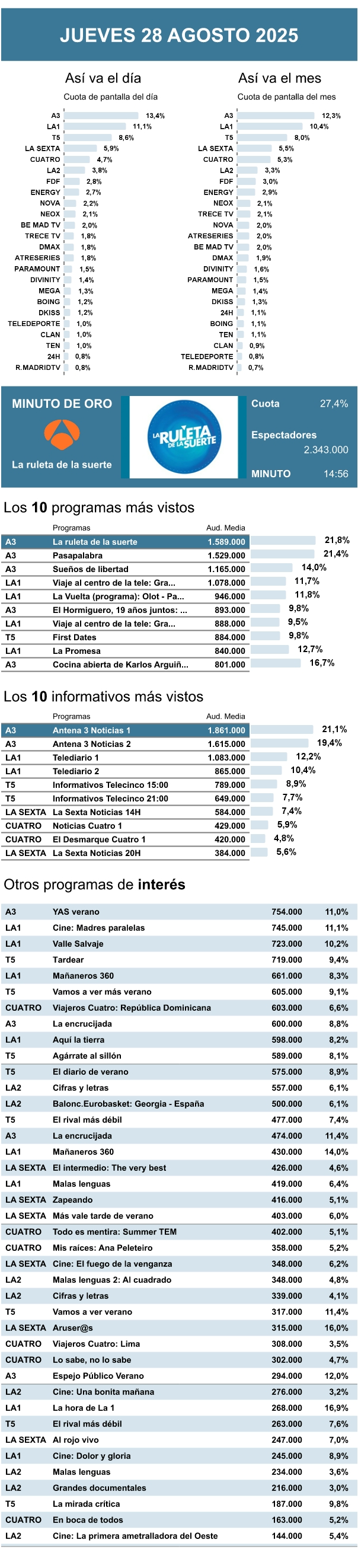 AUDIENCIAS: JUEVES 28 DE AGOSTO DE 2025