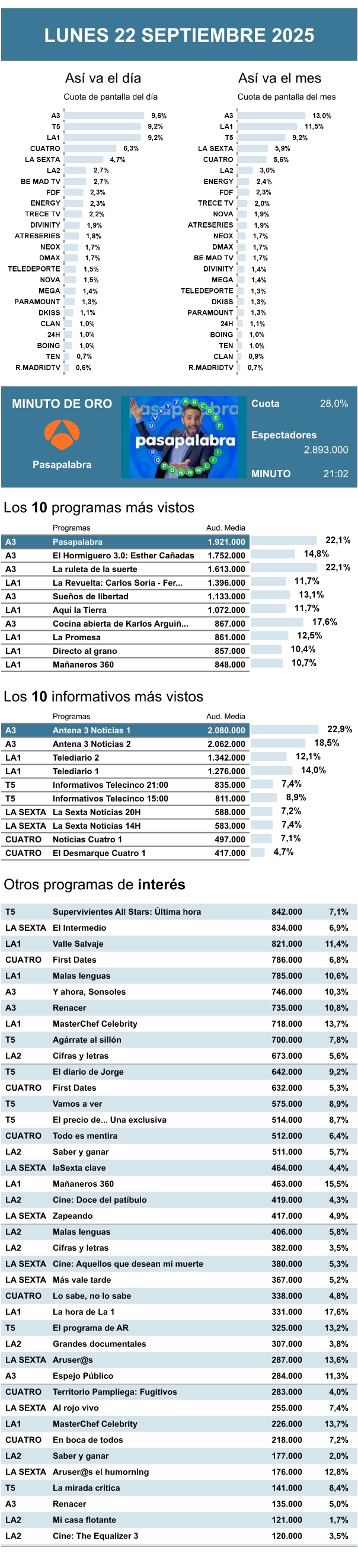 AUDIENCIAS: LUNES 22 DE SEPTIEMBRE DE 2025