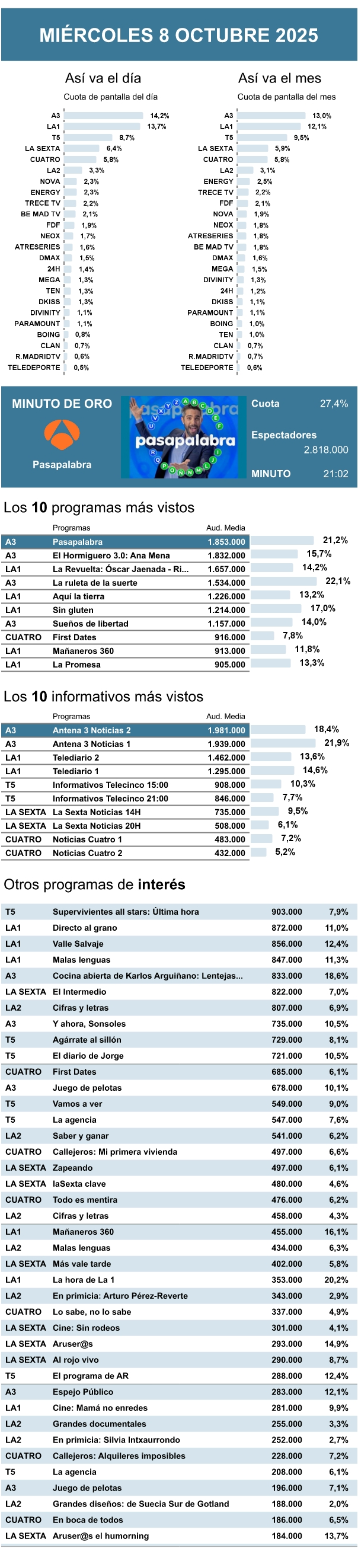 AUDIENCIAS: MIÉRCOLES 8 DE OCTUBRE DE 2025