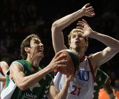 Unicaja no acababa de engrasar su maquinaria y eso lo aprovechó Tau Cerámica, que veía como perdía a su jugador más en forma Tiago Splitter, que se fue al banco con tres personales. Sin embargo, los vitorianos no acusaron la ausencia del brasileño, sino todo lo contrario, liderados por Planinic, endosaron un parcial de 12-0, que les permitía abrir diferencias 30-24.