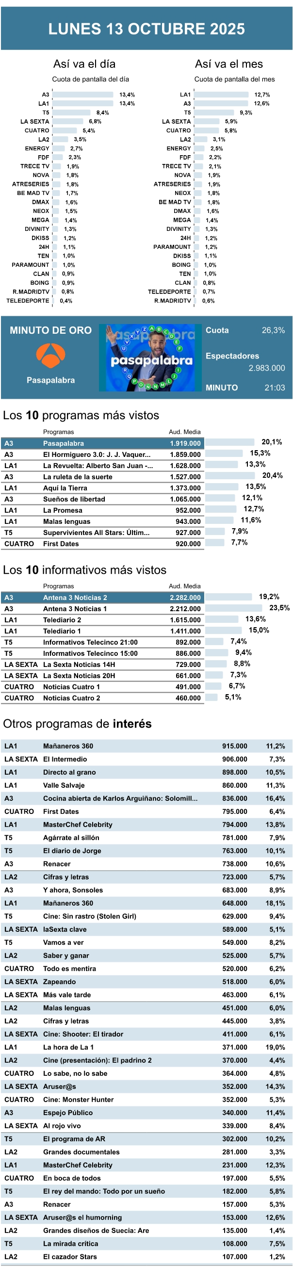 AUDIENCIAS: LUNES 13 DE OCTUBRE DE 2025