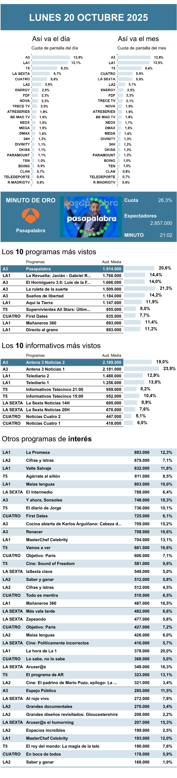 AUDIENCIAS: LUNES 20 DE OCTUBRE DE 2025