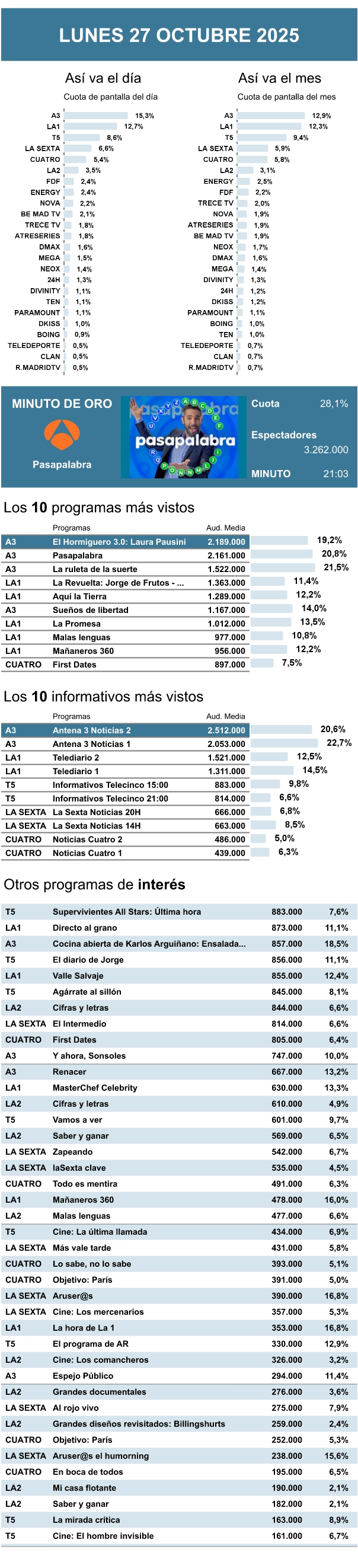 AUDIENCIAS: LUNES 27 DE OCTUBRE DE 2025