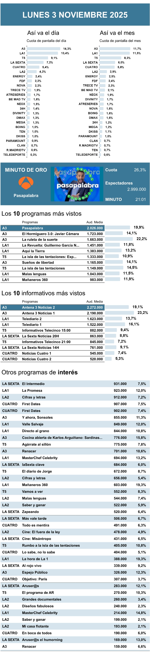 AUDIENCIAS: LUNES 3 DE NOVIEMBRE DE 2025
