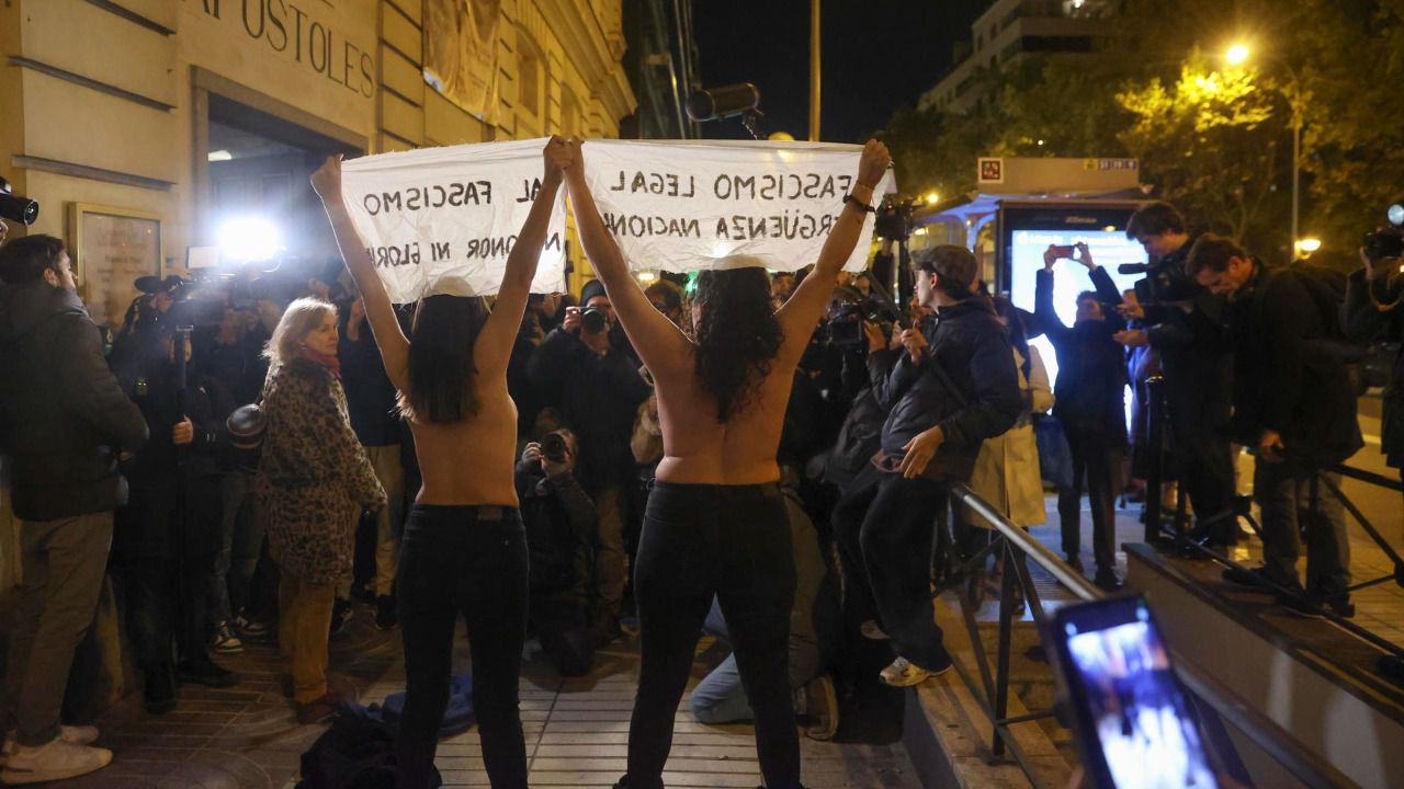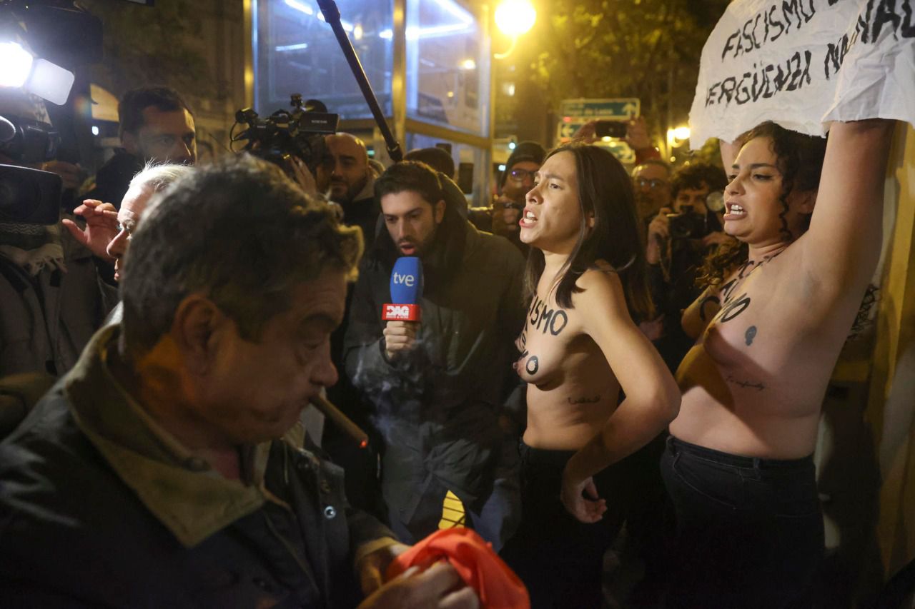 Dos activistas de Femen con el pecho descubierto han irrumpido esta tarde con gritos contra "el fascismo" en la puerta de una abarrotada parroquia de los Doce Apóstoles, eb Madrid, donde la familia de Francisco Franco y su fundación han organizado una misa con motivo del 50 aniversario de la muerte del dictador.