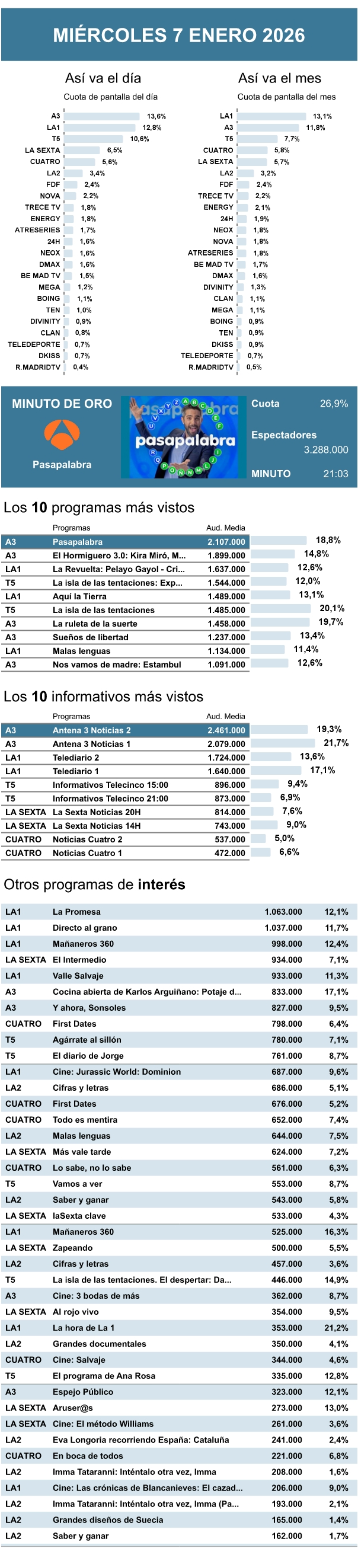 AUDIENCIAS: MIÉRCOLES 7 DE ENERO DE 2026