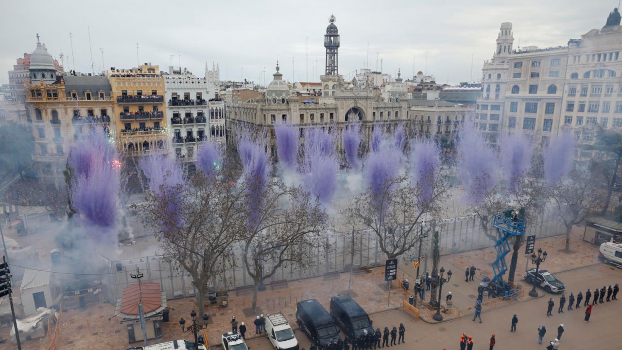 La pirotécnica Reyes Martí ha disparado la mascletà del 8 de Marzo de las Fallas de Valencia con los colores blanco y morado como protagonistas en el cielo de la plaza del Ayuntamiento, que ha vibrado con un estruendo que ha puesto final a la explosión de 146 kilos de materia pirotécnico en seis minutos.