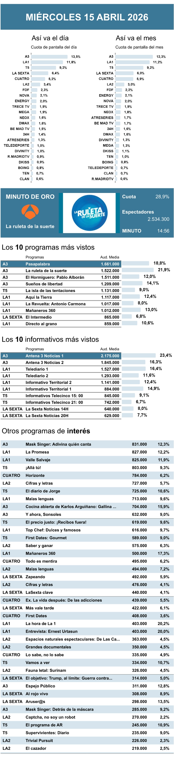 AUDIENCIAS: MIÉRCOLES 15 DE ABRIL DE 2026