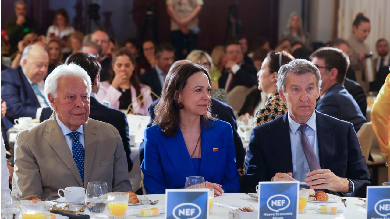 La líder opositora venezolana María Corina Machado ha protagonizado este lunes un desayuno informativo de Nueva Economía Fórum en Madrid, en el que ha sido presentada por el expresidente del Gobierno Felipe González, quien ha destacado su liderazgo "no mercenario" y ha defendido que la lucha por la libertad "no tiene color político; va de convicciones muy profundas".
