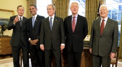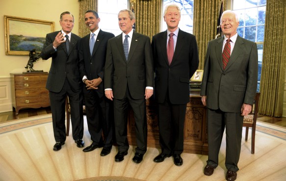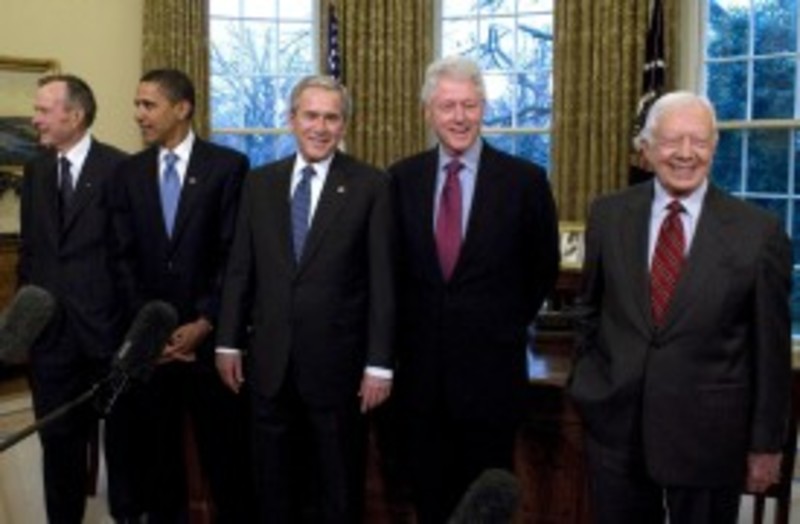 Bush, el actual jefe de la Casa Blanca, se colocó en el centro, junto a Obama y Clinton. En los extremos quedaron Bush padre y Jimmy Carter. Todos ellos aparecieron sonrientes y relajados. En unas breves declaraciones, el gobernante saliente aseguró a Obama, que asumirá el poder el próximo 20 de enero, que todos quieren "que tenga éxito". "Seamos demócratas o republicanos, amamos este país, y en la medida que podamos tenemos muchas ganas de compartir nuestras experiencias con usted. Todos los que hemos ocupado esta oficina entendemos que el cargo está por encima del individuo", agregó Bush.