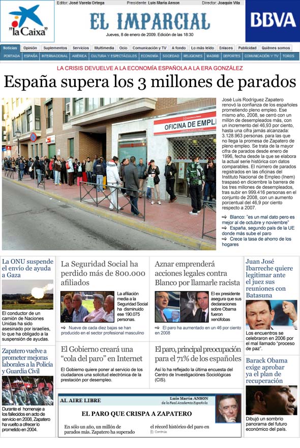 El número de parados registrados en las oficinas del Instituto Nacional de Empleo (Inem) traspasó en diciembre la barrera de los tres millones de desempleados, tras subir en 999.416 personas en el conjunto de 2008, con un aumento porcentual del 46,9 por ciento respecto a 2007. En concreto, el volumen total de parados alcanzó a cierre del pasado año la cifra de 3.128.963 desempleados, su nivel más alto en toda la serie histórica comparable, que arranca en 1996, y el más elevado desde 1987 si se tienen en cuenta los años en los que la metodología actual para el cálculo del paro no estaba vigente.