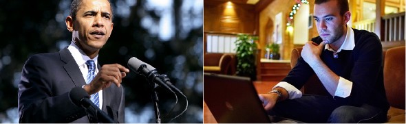 abajo izquieda), y que su voz es la que ya todos conocen. Sin embargo, sus palabras, su “yes, we can”, son obra de la persona que ven a su derecha. Con apenas 27 años, Jon Favreau (