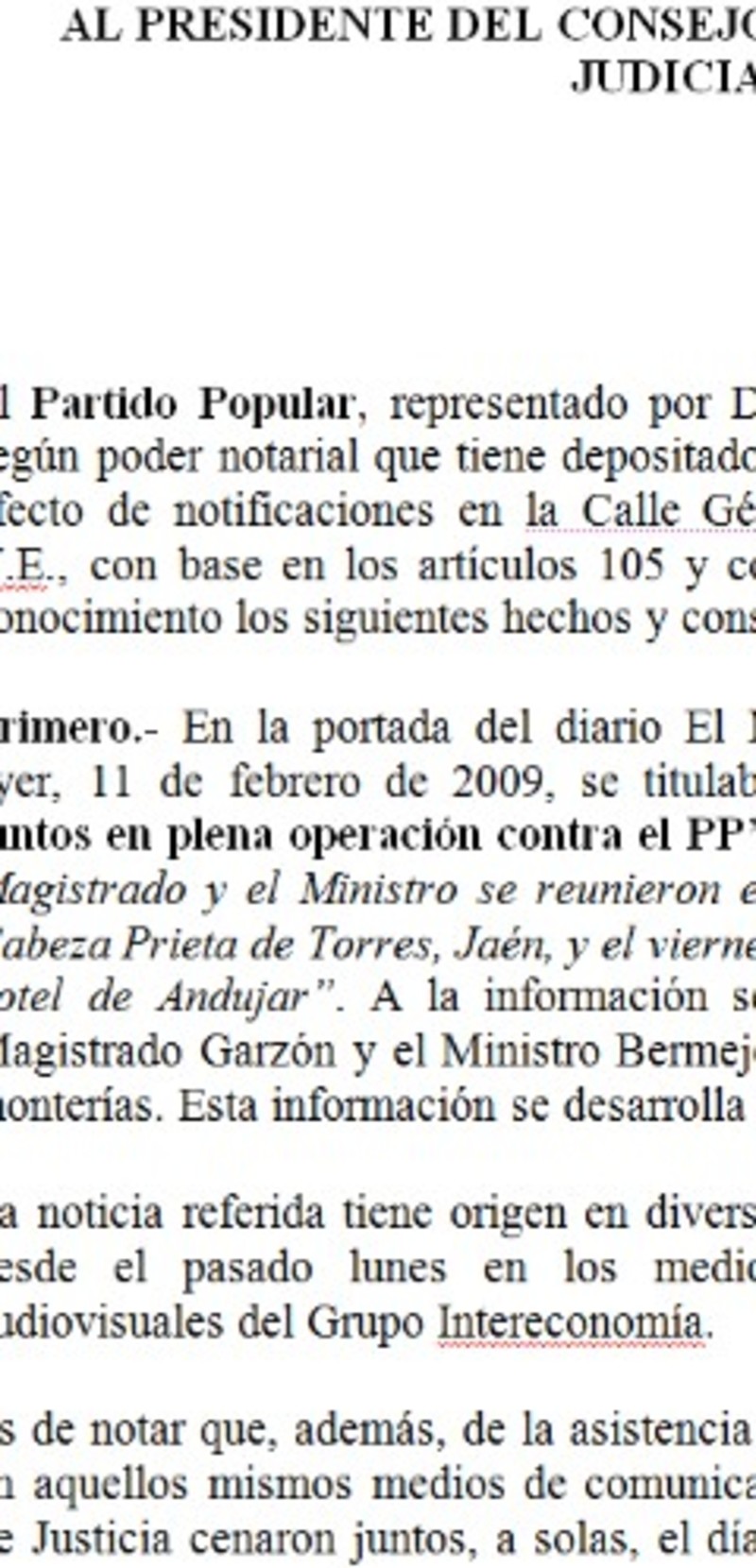 Este jueves, el Partido Popular ha dado respuesta al descontento con Garzón en forma de dos documentos que ha entregado en la Audiencia Nacional y más tarde en el Consejo General del Poder Judicial. El primero de ellos, que pide la recusación del juez, se remonta al año 1993, cuando Garzón fue incluido en la lista electoral del PSOE. El último, hecho público a última hora, insta al órgano de gobierno de los jueces a indagar sobre su ya célebre jornada de caza con Bermejo.