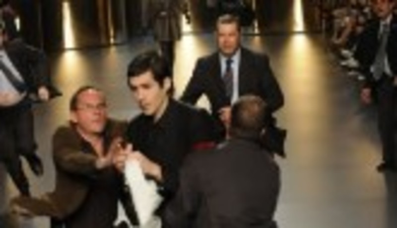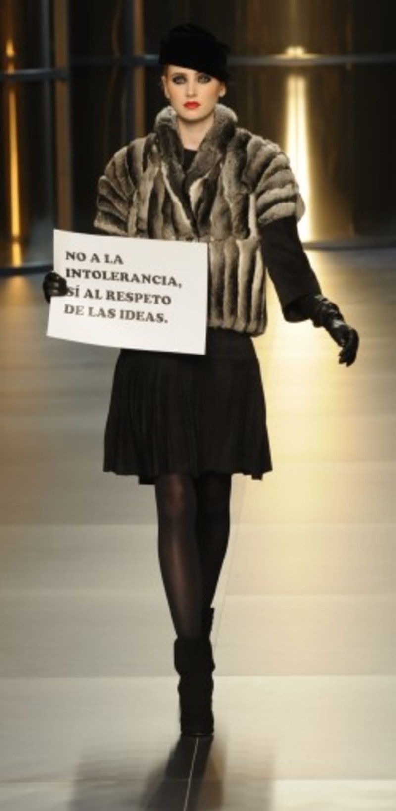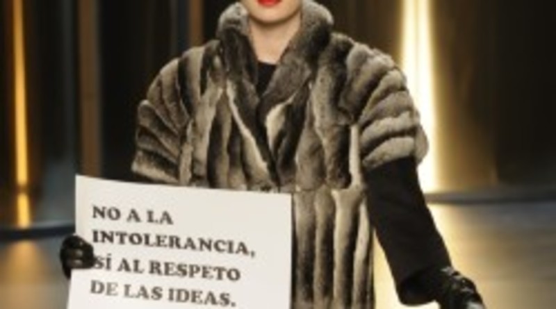 Ayer, durante el desfile de Roberto Torretta dos miembros del movimiento "Igualdad Animal" consiguieron mostrar en pasarela sendas pancartas en las que se podía leer "Pieles. Asesinato".