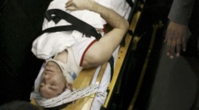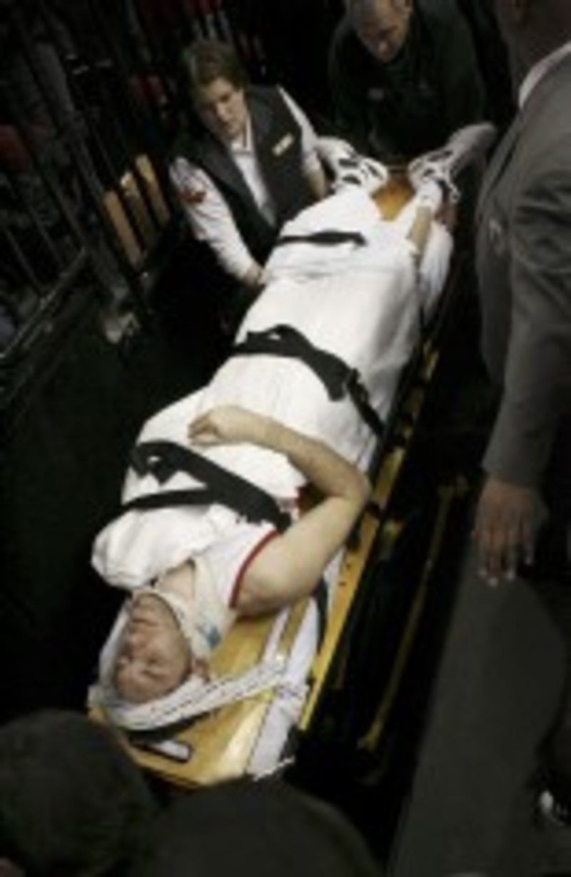 El novato español Rudy Fernández protagonizó la noche más dramática desde que llegó a la NBA al tener que abandonar el campo en camilla después de haber estado perfecto con todos los tiros que hizo a canasta.