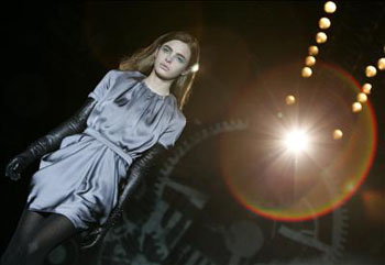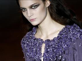 En cuanto a las telas, la diseñadora elige propuestas arriesgadas como estampados en seda combinados con paños de lana, neoprenos y terciopelo. Además, todos sus diseños van acompañados de guantes de cuero en tonos negros o verdes que cubren los brazos de sus modelos como si fueran las patas de un insecto. Lo mismo ocurre con las botas de mosquetero, que acompañan casi todas sus propuestas.