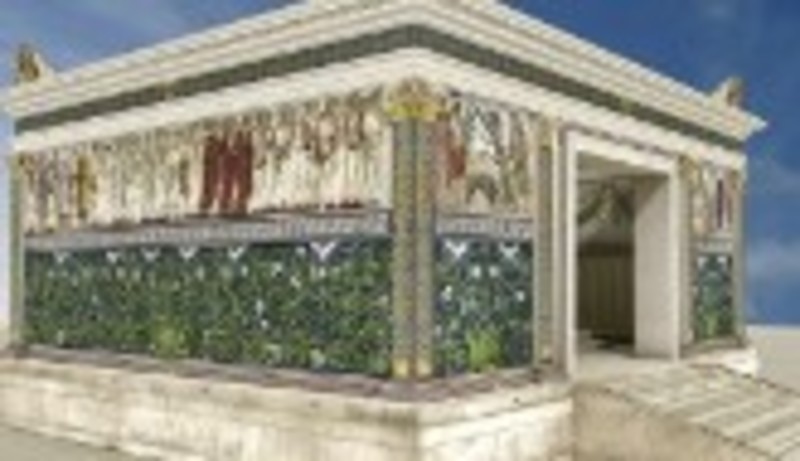El modelo, presentado en la conferencia, se ha generado a partir de los restos de policromía presentes en el mármol del monumento, de la observación del mismo a través de rayos UVA para detectar la base orgánica de preparación de la coloración, y de la comparación con otros edificios romanos y griegos que conservan sus pinturas.