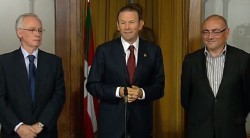 Tras el Consejo, Ibarreche ha comparecido acompañado de los miembros del llamado Consejo Político, Joseba Azkarraga (EA) y Javier Madrazo (EB), sus dos socios de gobierno, a los que ha abrazado.