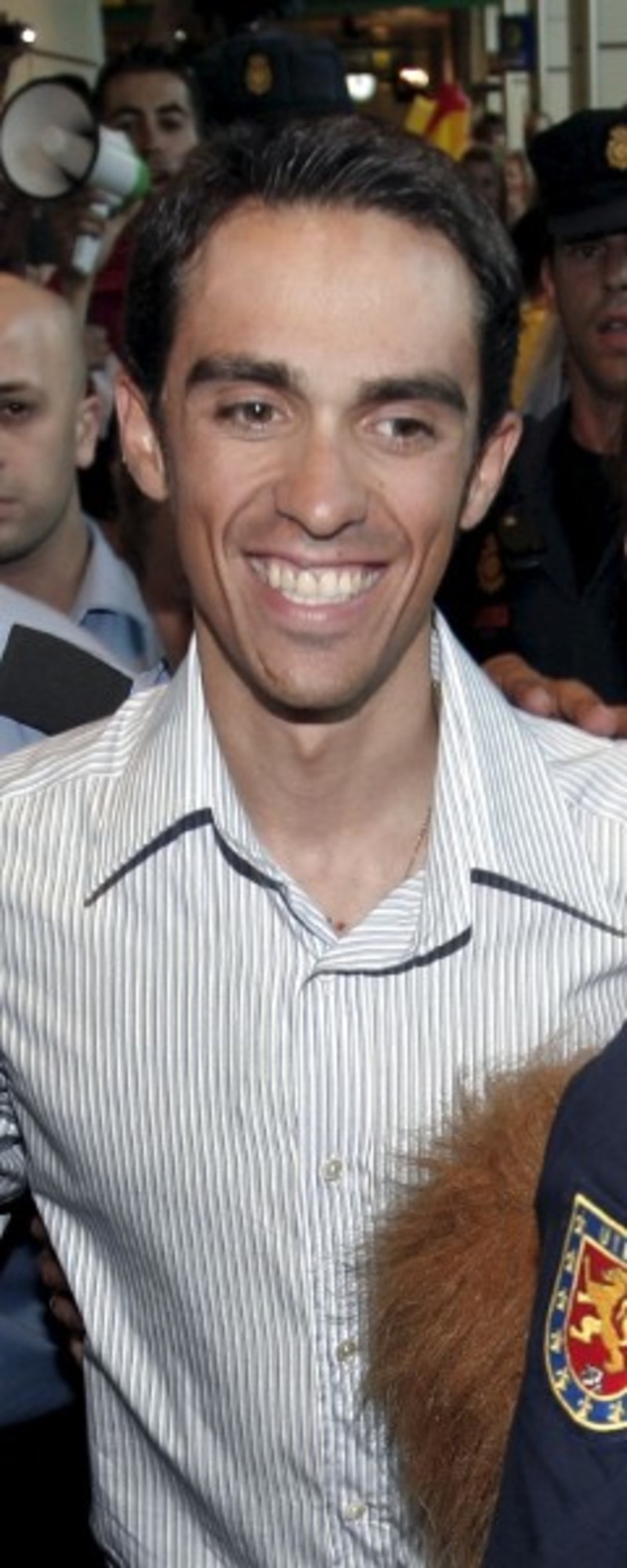 Respecto a la celebración del domingo en los Campos Elíseos de París, donde sonó el himno de Dinamarca en vez del español, Contador reconoció que "fue una enorme metedura de pata", y que al poner cara de circunstancias, "rectificaron, aunque tarde". Preguntado sobre el gesto con el que celebra las victorias, Contador explicó que empezó con el disparo en 2007 "como un guiño a mis amigos", que "significa que la victoria es para ellos".