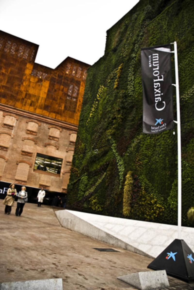 La nueva plaza, en sustitución de la gasolinera que surtía al tráfico, encauza la atención del paseante hacia un edificio erigido sobre tres pilares, que parece levitar y se abre al público con una escalinata serpenteante. Explanada que se atreve a rememorar los míticos Jardines Colgantes de Babilonia con la “bioescultura” de Patrick Blanc, un jardín vertical de 24 metros de altura enraizado en una estructura ecológica. El resultado compone un tapiz, una pintura de savia que exhala vida.