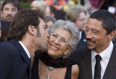 El actor español Javier Bardem (I), nominado en la categoría de Mejor Actor Secundario por la cinta 'No Country For Old Men' (No es un país para viejos), besa a su madre, Pilar Bardem (C).