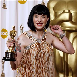 La escritora estadounidense Diablo Cody besa el Oscar que obtuvo en la categoría de Mejor Guión Original por "Juno".