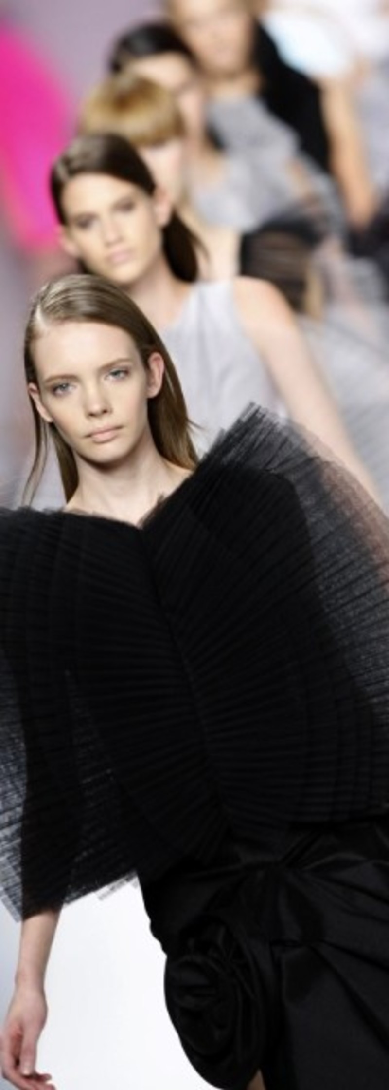 El otro gran protagonista de la colección de Amaya Arzuaga ha sido, sin duda, la superposición de capas. Las modelos han lucido imposibles superposiciones en pecho, espalda, a los lados y también con múltiples formas: lazos, abanicos, rosas, mariposas... Tampoco han faltado los plisados y gomas, además de las tiras en punto.