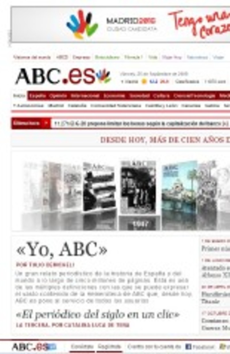 El diario ABC ha puesto a disposición de los internautas su famosa hemeroteca gracias a la digitalización de las páginas de sus ejemplares de más de 100 años de historia. Un árduo trabajo que se ve reflejado en un servicio gráfico con un buscador sencillo, que permite al usuario acceder a informaciones históricas filtrando por fecha o por palabras.