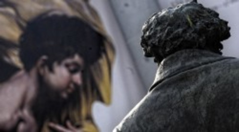 Goya, en un lateral, obra de Mariano Benlliure, mira de tú a tú al museo. Es la única de las tres que lo hace. La de