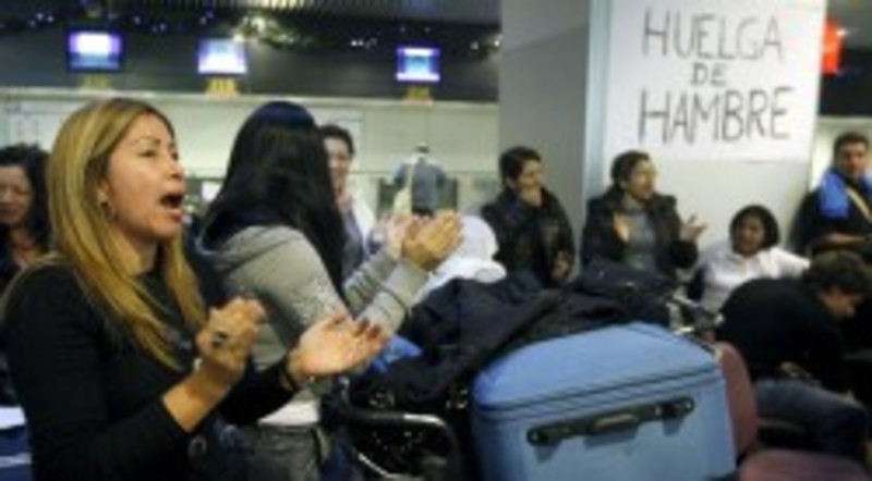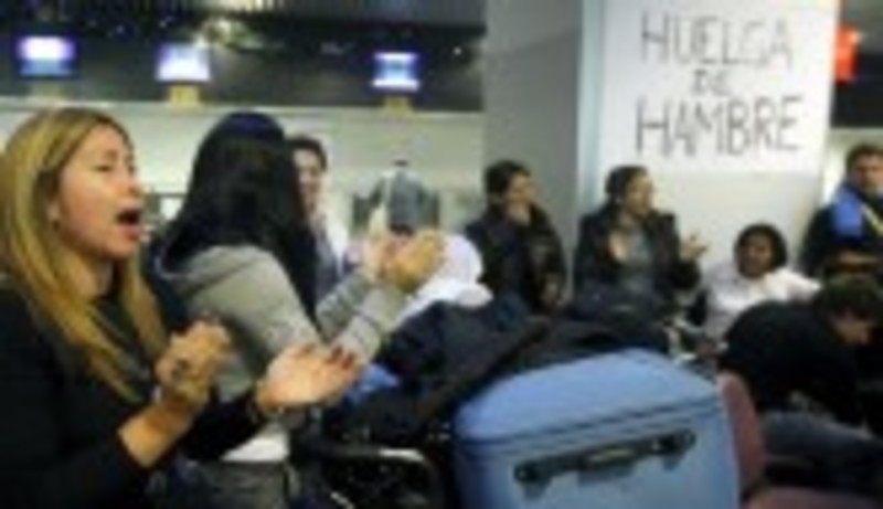 Media docena de pasajeros de Air Comet, de nacionalidad ecuatoriana y colombiana, han colgado esta mañana frente a los mostradores de la aerolínea un cartel en el que afirman que están en huelga de hambre, como medida de presión para que les lleven a su país y poder pasar las Navidad con sus familias.