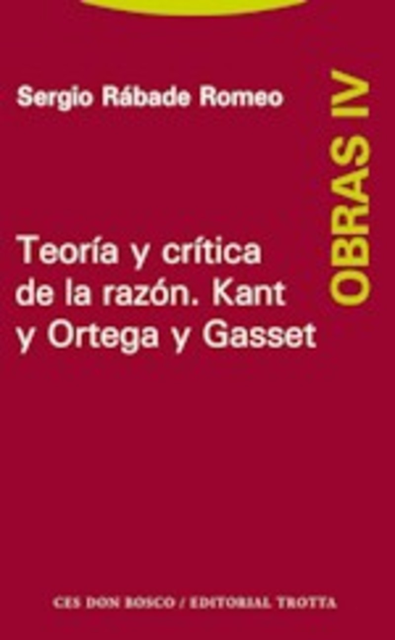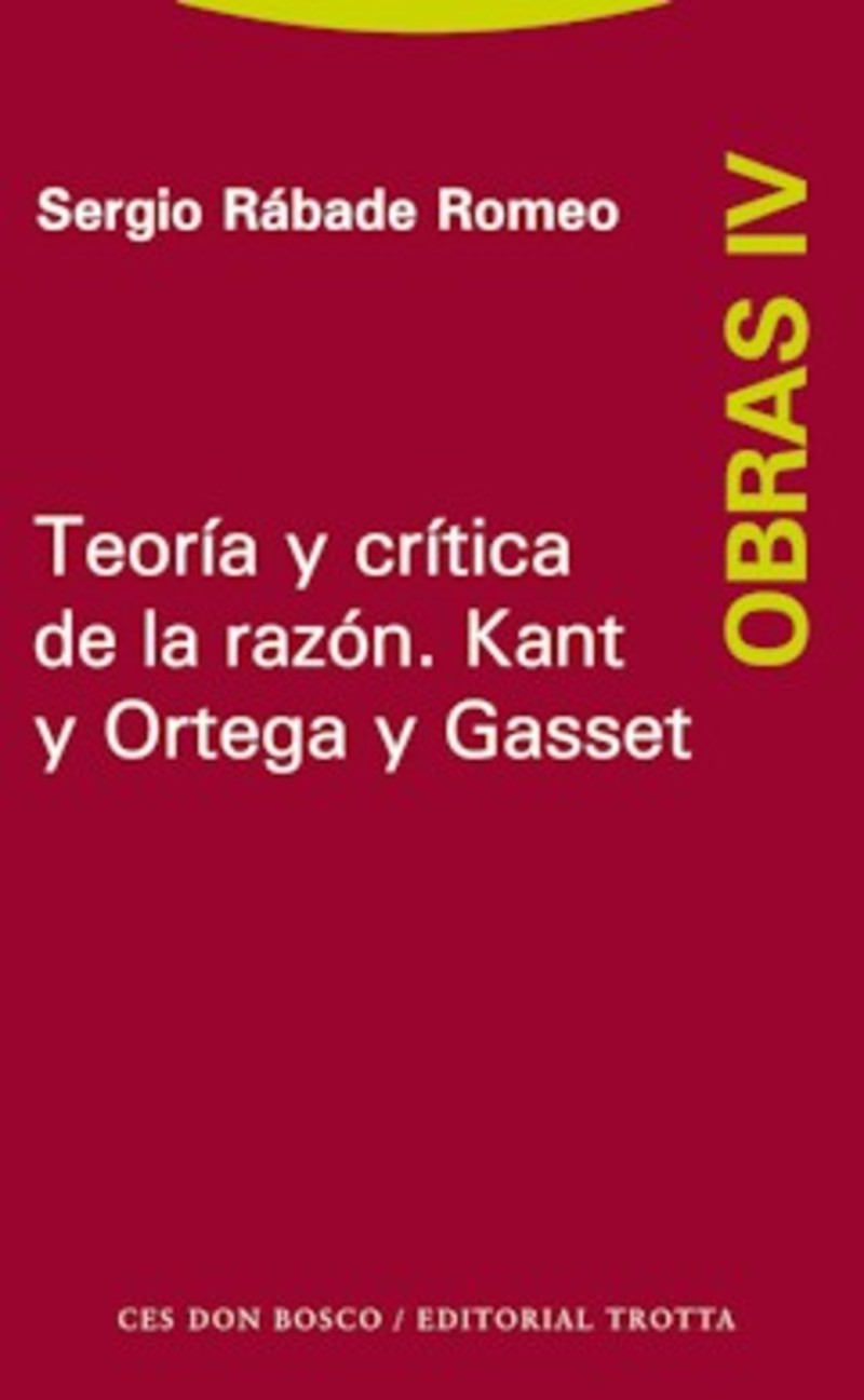 El cuarto volumen de las Obras completas de Sergio Rábade, titulado Teoría y crítica de la razón. Kant y Ortega y Gasset, forma parte de un gran proyecto editorial que durante los últimos años ha venido recopilando y ordenando los trabajos que el profesor Rábade, reconocido filósofo y activo conferenciante y escritor, ha compuesto a lo largo de toda una vida de dedicación a la Filosofía y su magisterio. En sus textos, no es difícil encontrar evidencias de esa vocación didáctica que acompaña al proceder escrupuloso de sus estudios y a su meticulosidad crítica como pensador e historiador de la filosofía.