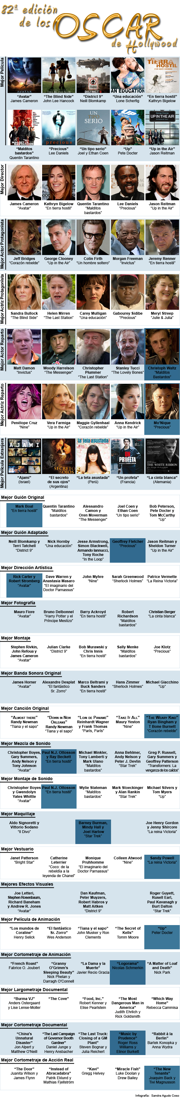 Las candidaturas a la 82 edición de los premios Óscar que concede anualmente la Academia de Artes y Ciencias Cinematográficas se dieron a conocer hoy y se entregarán en una gala el próximo domingo de 7 de marzo en Los Ángeles.