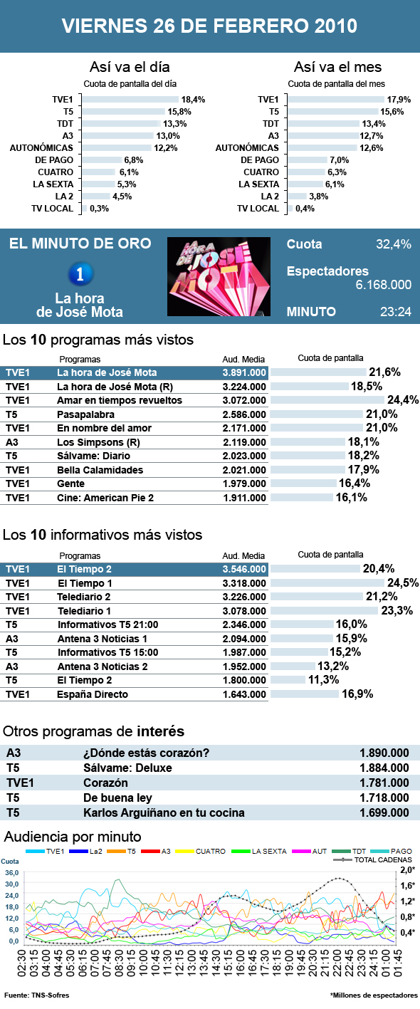 Sálvame Deluxe y DEC consiguieron empatar este viernes con casi dos millones de telespectadores. Sin embargo, los programas del corazón quedaron fuera del top ten de los programas más vistos. Fue La hora de José Mota, con casi cuatro millones de telespectadores y el 21,6 por ciento del share, la gran trinfadora de la noche del viernes una vez más. Sólo Amar en tiempos revueltos consiguió un share mejor, del 24,4 por ciento.