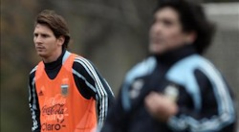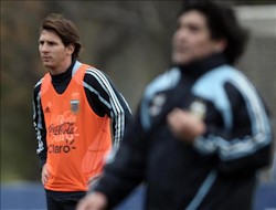 El Mundial Quizá sea este punto el más arduo en el debate. Diego Maradona dejó para la leyenda del deporte su mejor actuación en el Mundial de México ´86, dando a Argentina su segundo entorchado máximo, con el mejor gol en la historia del balompié, la mítica "Mano de Dios" y la asistencia más celebrada de los mundiales, que significó el gol de la victoria sobre Alemania en la final. Además, el “Pelusa” situó a su selección, casi en solitario, en la final de Italia ´90, acompañado por un grupo de jugadores bajos de forma y de calidad, salvo excepciones como Caniggia. Leo Messi ha entrado en la albiceleste en una de las peores épocas que ha atravesado el combinado argentino en su historia, encadenando muy malas actuaciones en los últimos mundiales de Alemania y Corea-Japón. Al blaugrana se le reclama, sobretodo en su país, que en la selección no rinde como en el Barça. Con vistas a la próxima cita de Sudáfrica, y con el ídolo de su infancia -y actual rival por el cetro de Dios del balompié- Maradona como entrenador, Leo acudirá no como desafiando a los rivales ni a sus compatriotas detractores, sino retando a la historia, a los más grandes de este deporte.