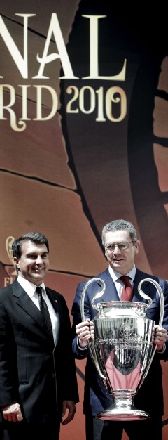 En un acto cargado de morbo por la rivalidad entre el Barça, vigente campeón y aspirante de nuevo al título, y el Real Madrid, club que más Copas de Europa ha ganado y anfitrión de una final que no juega desde 2002, los representantes del equipo azulgrana dejaron el trofeo en manos de Ángel María Villar, presidente de la Federación Española.