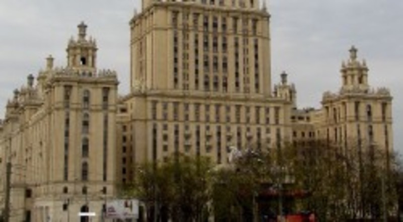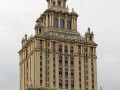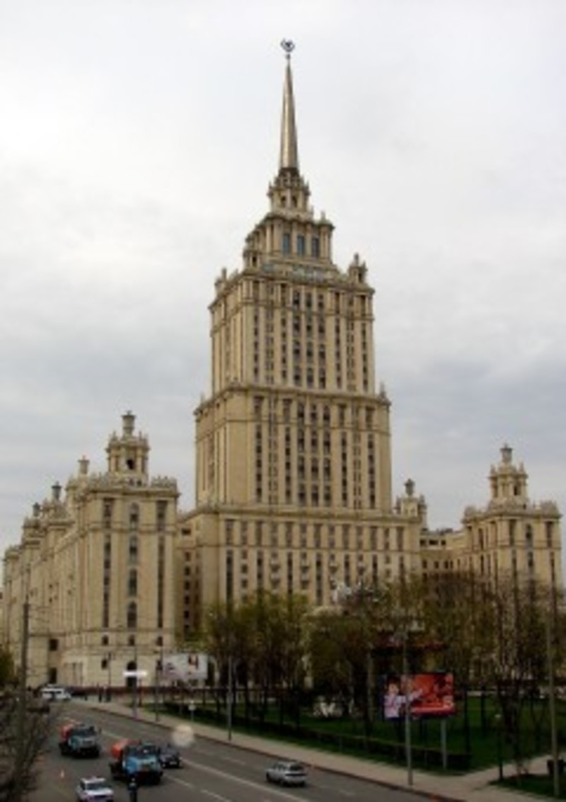 El más rebuscado lujo capitalista se da cita con el clásico arte socialista soviético en el legendario hotel "Ucrania", una majestuosa torre del llamado estilo "'imperio' estalinista", de 35 plantas y 206 metros de altura con la aguja, que fue en su día el hotel más alto de Europa.