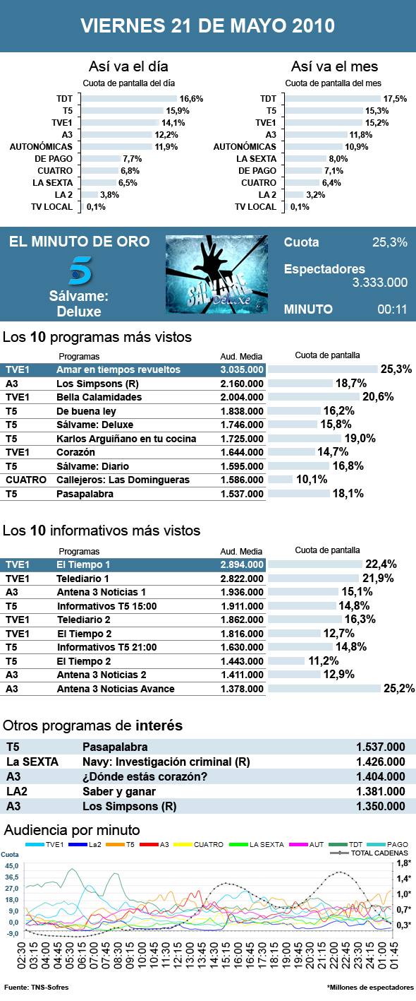 Sálvame Deluxe no da tregua y un viernes más ha liderado el minuto de oro con más de tres millones de telespectadores y un 25,3 por ciento del share. Sin embargo, el programa más visto fue Amar en tiempos revueltos que igualó la cuota de pantalla de Sálvame Deluxe, aunque tuvo una cifra de seguidores un poco inferior.